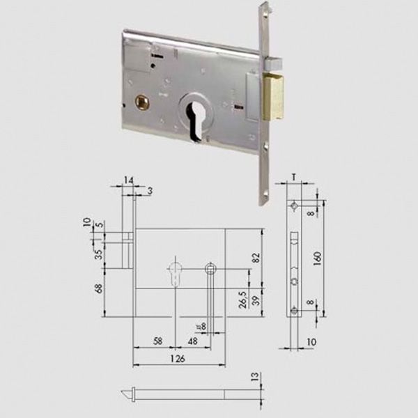 Електромеханічний замок, врізний, встановлення внутрішнє, самоблокуюча засувка, 2,3 тип дверей (2-тип: двері відчиняються всередину, дверні петлі зліва, ручка справа; 3-й тип: двері відчиняються назовні, дверні петлі праворуч, ручка зліва), 12В / 2А. Відчинення відбувається подачею живлення 12В на контакти замка, також можливо відчинення ключем.