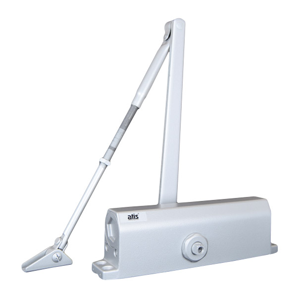 ATIS DC-5036-BC Silver дотягувач верхнього монтажу з важільною передачею. Комерційне використання, напрацювання на відмову 1000000 циклів. Зусилля закривання від DIN3 до DIN6 (вага дверей від 60 до 120 кг, ширина від 950 до 1400 мм). Функція Back-check. Колір срібний.