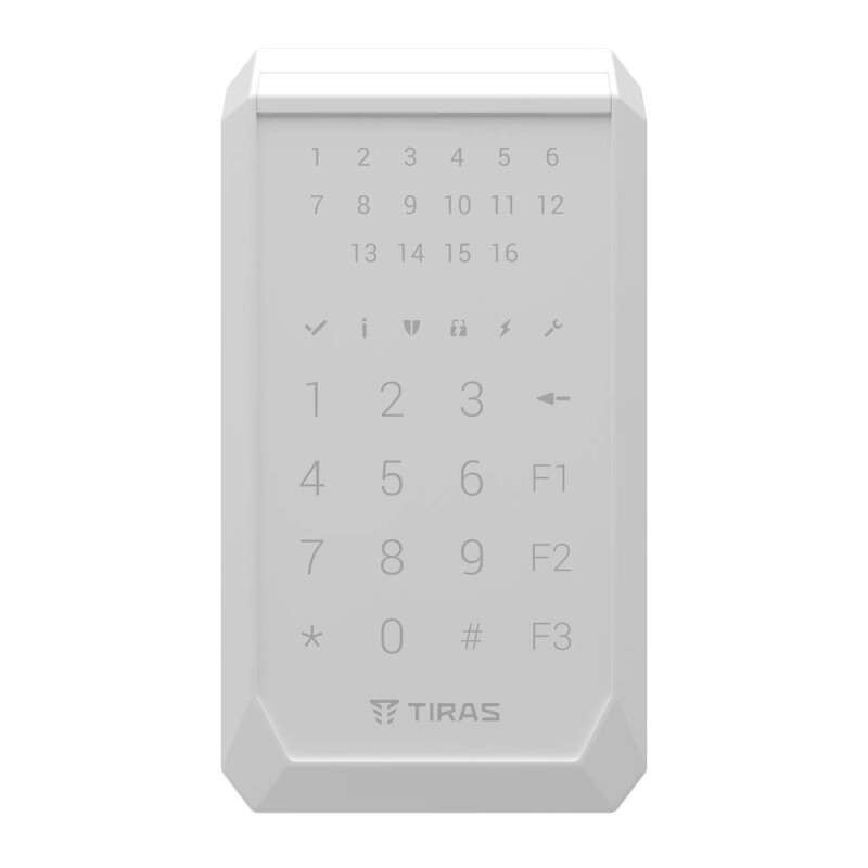 K-PAD 16 призначена для керування охоронною системою - постановка/зняття з охорони, перегляд стану системи та інші базові функції керування. Клавіатура має сенсорне клавішне поле та можливість підключення зчитувача Touch Memory для магнітних ключів, які можна використовувати замість цифрового коду доступу.