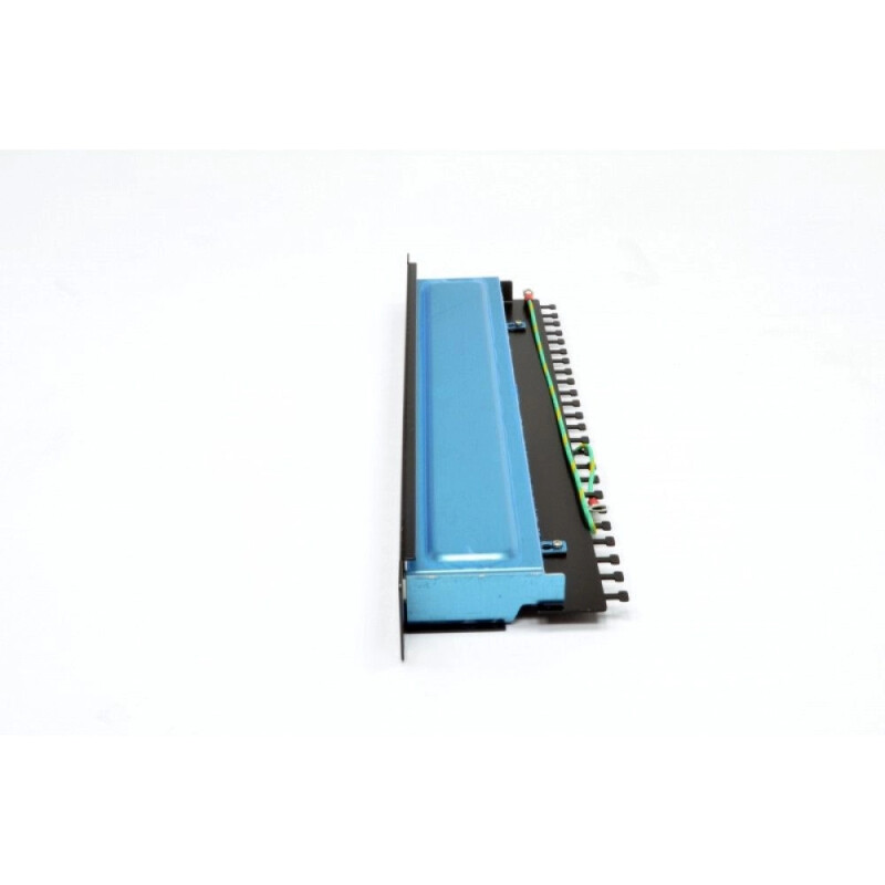 • На тильній стороні розташована плата, на якій встановлені пластикові модулі з мідними ножами для розключення звитої пари методом «забивання». Нанесена кольорова схема A і B. Звита пара підводиться і кріпиться пластиковими стяжками до кабельного організатора, розрахованому на 24 линка, з додатковою фіксацією екрану металевими зажимами