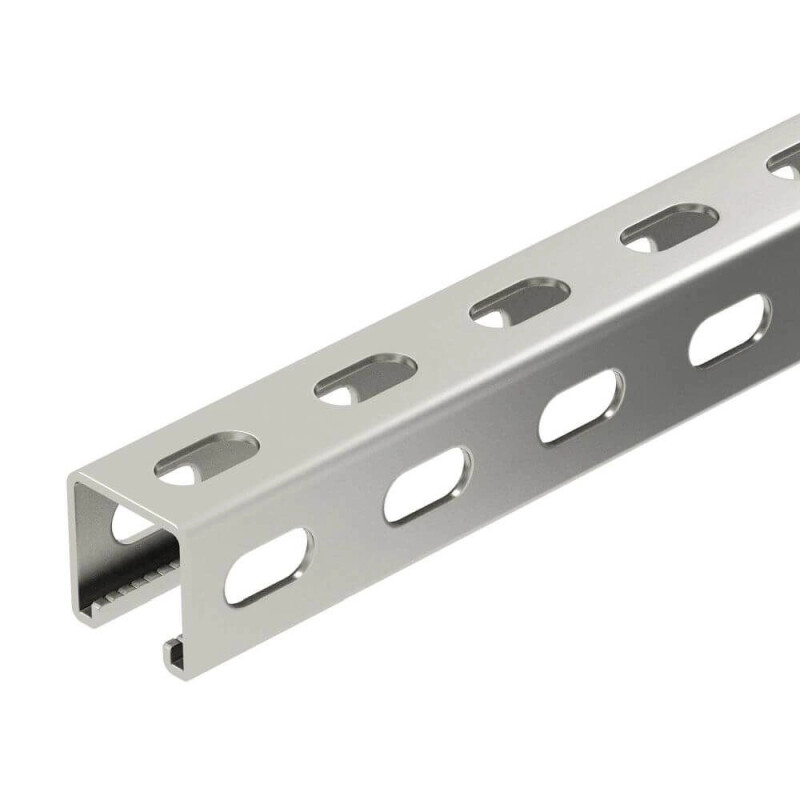 Надміцна C-подібна профільна рейка з перфорованою бічною стінкою, призначена для індивідуального встановлення опорних конструкцій, наприклад, кабельних лотків, або для використання як панель для розподільних шаф.