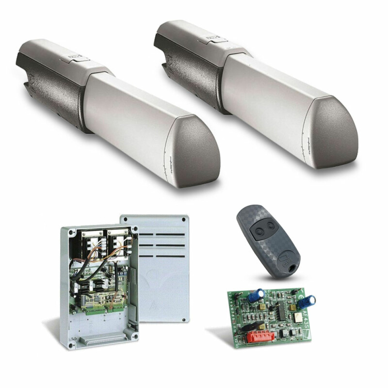 Комплект автоматики для розпашних воріт шириною до 3 м і вагою до 800 кг ATI 3000. До складу комплекту входять: 2 приводи, що самі замикаються, з кінцевими вимикачами A3000A, панель керування у коробі ZA3P, одноканальний радіоприймач AF43S, двоканальний пульт дистанційного керування TOP-432EE. Комплект підходить для воріт, що відчиняються як назовні, так і всередину території.