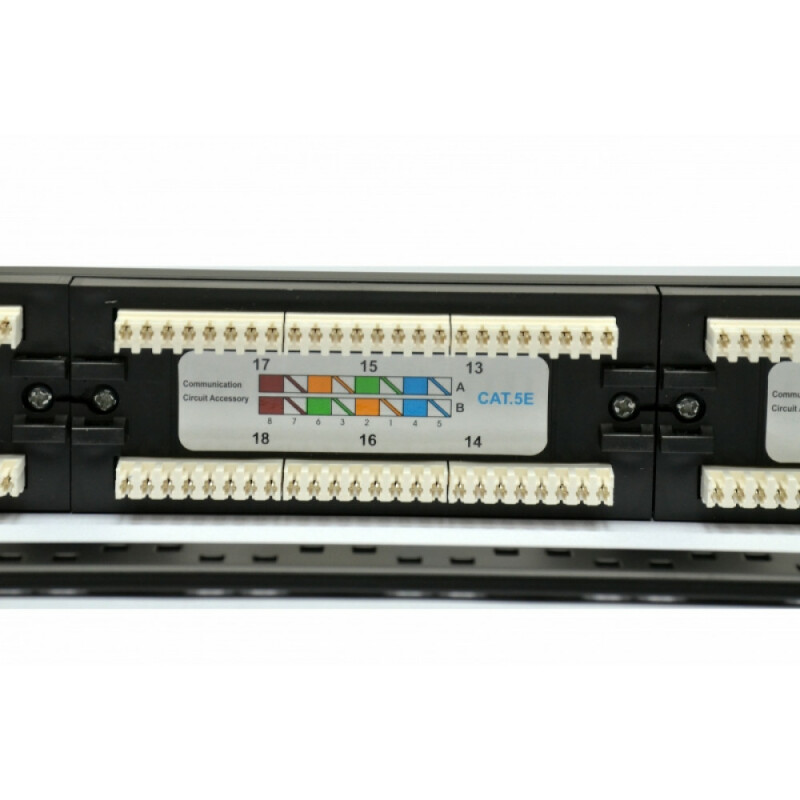- На тильній стороні розташована плата, на якій встановлені пластикові модулі з мідними ножами для розключення звитої пари методом «забивання». Нанесена кольорова схема A і B. Звита пара підводиться і кріпиться пластиковими стяжками до кабельного організатора, розрахованого на 24 линка