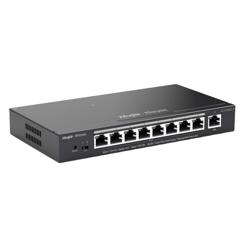 Ruijie RG-ES209GC-P — це 9-портовий гігабітний інтелектуальний комутатор, який підтримує технологію Power over Ethernet (PoE). Це означає, що він може передавати дані та живлення по одному Ethernet-кабелю, що спрощує встановлення та під'єднання мережевих пристроїв, як-от IP-камери, VoIP-телефони, бездротові точки доступу та інші мережеві пристрої.
