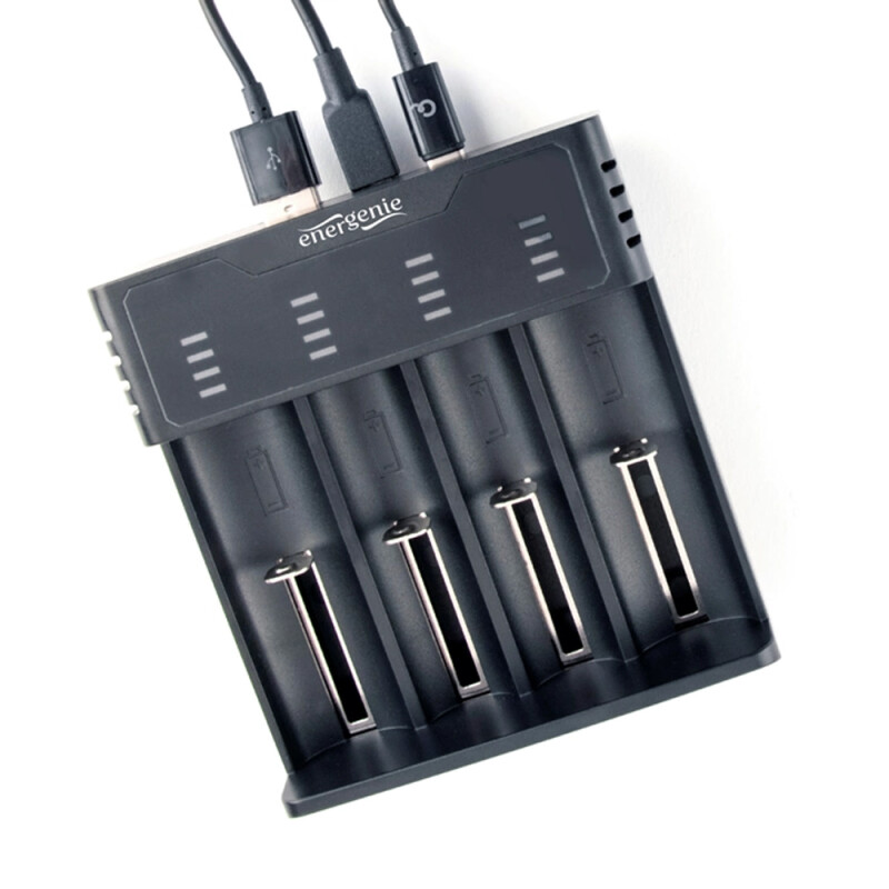 Зарядний пристрій EnerGenie BC-USB-02 підходить для заряджання літій-іонних акумуляторів типів 26650, 22650, 18650, 18500, 17500, 14500, 16340 і Ni-MH / Ni-CD акумуляторів типів A, AA, AAA, SC, C. Пристрій має 4 незалежні канали для заряджання акумуляторів.