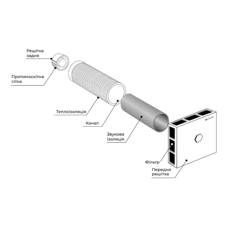 - в оголовку провітрювача знаходиться спеціальне набивання, яке є утеплювачем і одночасно дозволяє поглинати сторонні шуми з вулиці. Завдяки цьому установка працює тихо, а холодне повітря не задуватиметься в приміщення.