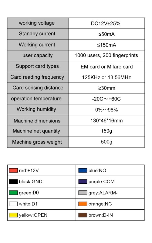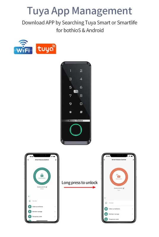 Це пристрій нового покоління, стильний, водонепроникний контроль доступу за відбитками пальців Tuya, інтегрований автономний контролер з функцією зчитування карт, корпусом з АБС-пластику, захистом від злому, класом водонепроникності IP66, підходить для використання на відкритому повітрі. Підтримує 200 відбитків пальців/880 відбитків пальців + 1000 користувачів карток, з відкриттям дверей програми/відкриттям дверей по відбитку пальця, відкриттям дверей карткою, відкриттям дверей паролем, відкриттям дверей з тимчасовим паролем, згенерованим додатком, та відкриттям дверей кількома користувачами. Підтримка користувачів-відвідувачів може бути налаштована як професійний пристрій зчитування карт Wiegand і може завантажувати/завантажувати дані користувача картки або пароля. Має функцію виявлення дверного контакту.Система контролю доступу Tuya Smart WIFI для домашньої безпекиБіометрична система контролю доступу з паролем, відбитком пальця, функцією наближення RFID та вбудованим Wi-Fi для зручного підключення. Сучасний та елегантний дизайн добре впишеться у будь-яке робоче середовище.Насолоджуйтесь спокоєм та надійними функціями, такими як віддалений моніторинг та управління, і зробіть своє життя краще простіше з віртуальними гостьовими ключами, автоматичним блокуванням та розблокуванням.Різні можливості розблокуванняРозблокування за відбитком пальця, паролем, IC-картою та додатком .Голосовий супровід. Контролює доступ відбитка пальця.Управління із програмиПідтримка керування програмами Tuya Smart або Smartlife в магазині IOS або Google Play. У програмі ви можете керувати відкритою коробкою/встановленою коробкою відбиток пальця/встановити пароль/поділитися паролем/перевірити відкритий запис тощо.Біометричний контроль доступуУповноважені особи одержують доступ до броньованих дверей, пред'явивши зареєстрований відбиток пальця сканеру.Успішні запити підтверджуються звуковим повідомленням.Доступ до дверей швидкий, ефективний і повністю підписується, він також включає вбудований безконтактний зчитувач RFID.Біометричні можливості та реєстраціяКонтролер може зберігати кілька відбитків пальців кожної людини, щоб захистити його від пошкодження чи стирання одного пальця.Процес реєстрації простий і зрозумілий і займає лише 10 секунд на людину.Контролер може зберігати до 100 шаблонів відбитків пальців.Сценарії входу/виходу у дверіКонтролер підключається до більшості внутрішніх та зовнішніх дверей і діє як перемикач відкриття механізму блокування дверей для авторизованих користувачів.Контролер можна використовувати в тандемі з нашими біометричними дверними контролерами та безконтактними периферійними пристроями для керування вхід та вихід з обох боків однієї двері або для контролю руху через дві або більше точки входу.Управління всіма пристроями здійснюється централізовано через програму Tuya smart або Smartlife.Авторизації, графіки та моніторинг у реальному часіПодії входу можна переглядати за допомогою моніторингу в реальному часі та призначений внутрішній адміністратор може легко реєструвати користувачів та керувати ними.Також можна встановлювати паролі та електронні ключі з обмеженим терміном дії тільки для одного входу.Широкий спектр використанняНадає складне та масштабоване рішення контролю доступу для вашого бізнесу, будинки, будів