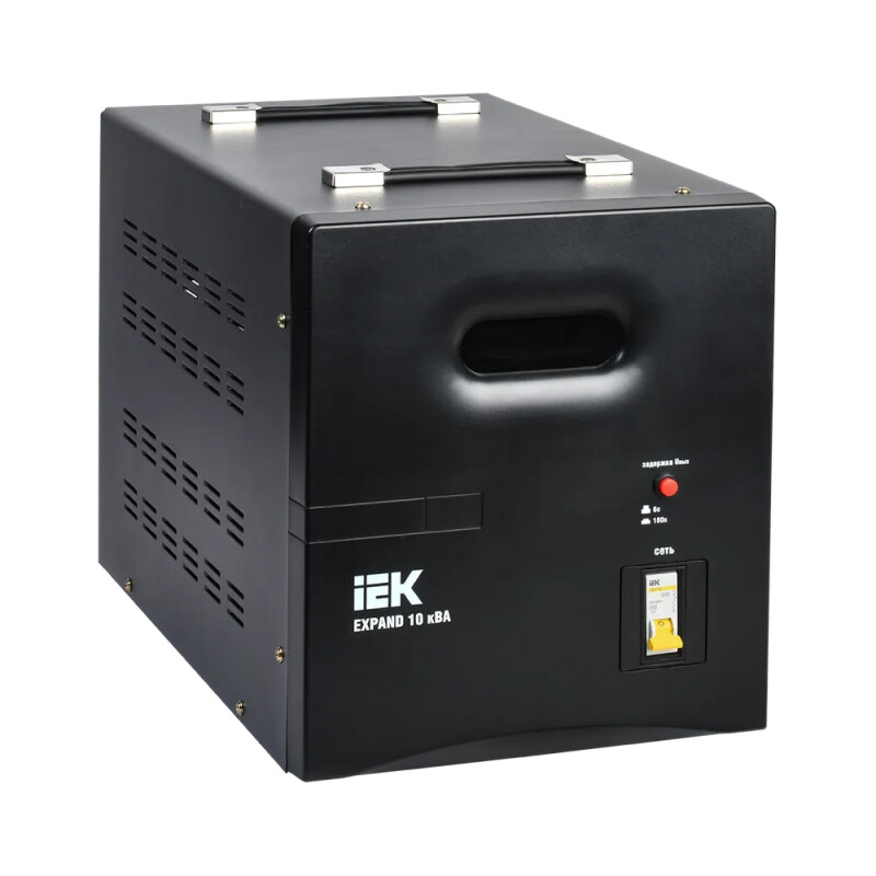 Стабілізатор напруги однофазний переносний EXPAND 10 кВА IEK — призначений для підтримання стабільної однофазної напруги живлення навантажень побутового та промислового призначення 220 В, 50 Гц у разі відхилень мережевої напруги в широких межах за значенням і тривалістю. У разі зміни напруги мережі в діапазоні від 100 до 260 В стабілізатори підтримують рівень вихідної напруги 220 В з точністю 8 %. Функції захисту забезпечують безпечну експлуатацію стабілізаторів у безперервному режимі. Стабілізатор має на лицьовій панелі багатофункціональний індикатор, що відображає режими роботи, рівень завантаження стабілізатора за потужністю і рівні вхідної та вихідної напруги.
