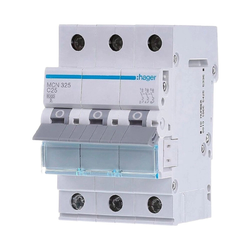 Автоматичний вимикач Hager MCN325 3P 6 кА C-25A 3M встановлюється в електричних щитах на стандартну напрямну DIN-рейку і може використовуватися як для побутових, так і для промислових цілей. Він швидко реагує на перевантаження і короткі замикання, автоматично вимикаючи електричний ланцюг для запобігання загоряння і пошкодження обладнання. Він також може працювати як вимикач для ланцюгів навантаження.