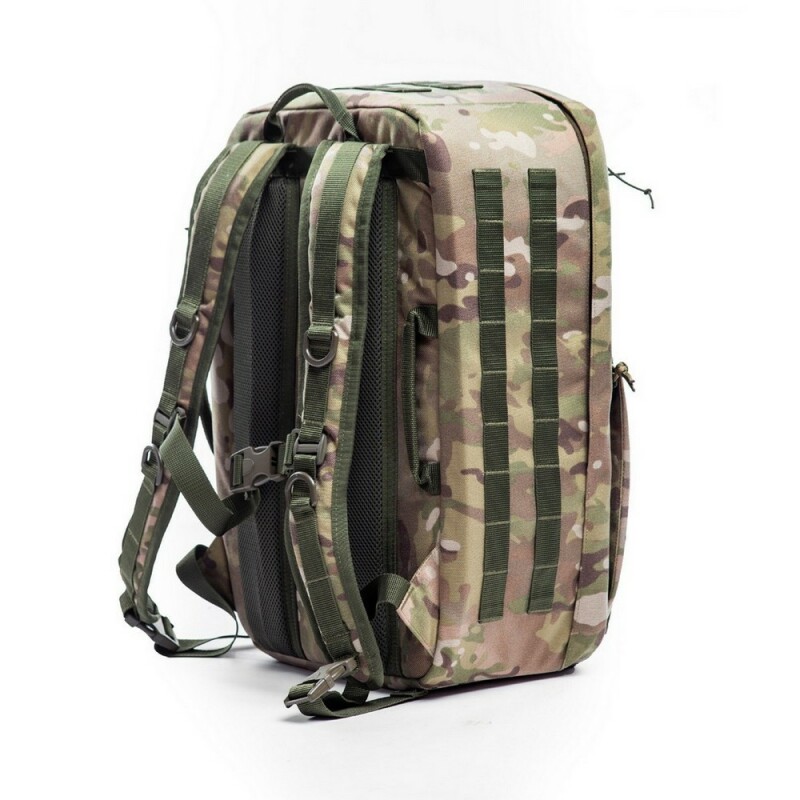 - Кріплення MOLLE: З усіх боків та зовнішньої сторони розташовані модульні кріплення для підсумків або додаткового спорядження. Можна розмістити обладнання на зовнішній стороні рюкзака, а з боків – антени та дроти.