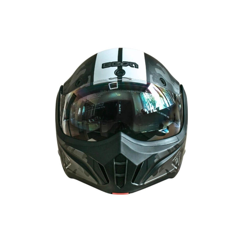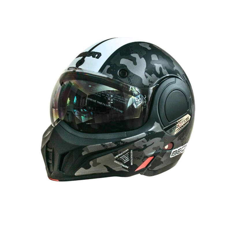 Універсальний шолом-трансформер, нижня частина якого (захист підборіддя) відкидається і фіксується на потилиці. Шолом виконаний з міцного ABS пластику, має подвійний візор: прозорий із захистом від подряпин і висувний тонований сонцезахисний. Шолом відрізняється невеликою вагою та продуманою вентиляцією. Ударопоглинаюча капсула шолома зроблена зі спіненого пінопласту EPS. М'яка знімна внутрішня підкладка виконана з гіпоалергенних матеріалів, допускає прання.