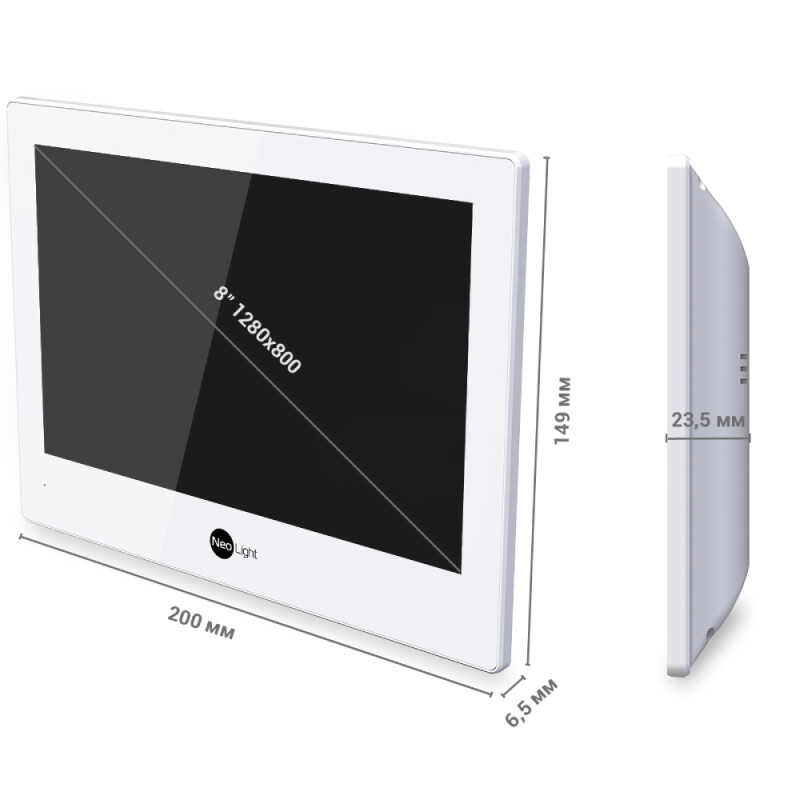 • домофон Neolight ALPHA Hybrid white оснащений кольоровим IPS-екраном з діагоналлю 8 дюймів та роздільною здатністю 1280*800 пікселів;