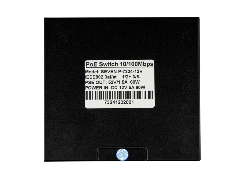PoE-комутатор SEVEN P-7324-12V — зручне та надійне рішення для системи відеоспостереження. Він підтримує стандарт IEEE 802.3af/at та оснащений 4 PoE-портами 100 Мбіт/с для підключення відеокамер, а також 2 Uplink-портами 100 Мбіт/с для з’єднання з мережею.