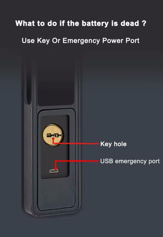 Замок завчасно попереджає про низький заряд батареї. У випадку повної розрядки замок можна відкрити механічним ключем або підключити живлення через порт micro-USB для аварійного доступу.