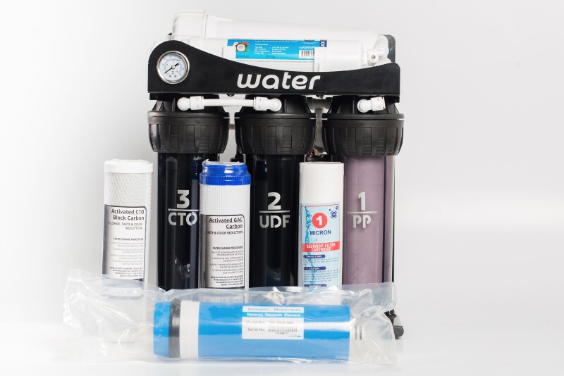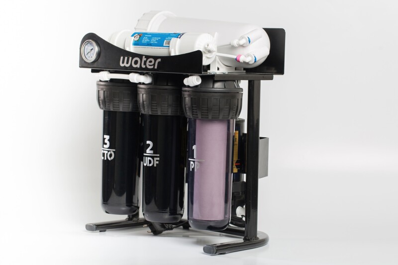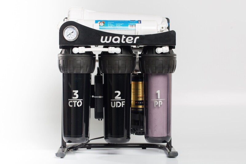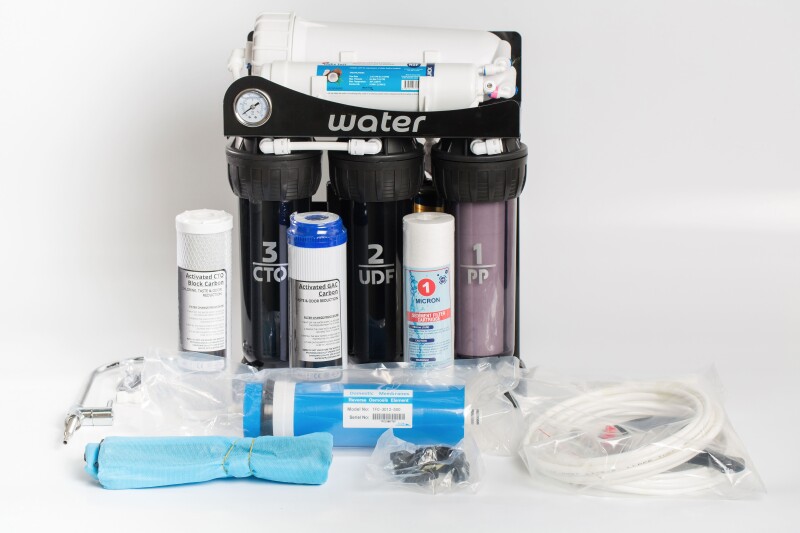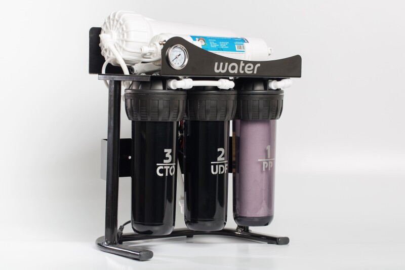 1 стадія: Поліпропіленовий картридж 1 мкм — усуває механічні частинки (пісок, іржа) 2 стадія: Гранульований вугільний картридж — видаляє хлор, органіку 3 стадія: Брикетований вугільний картридж 5 мкм — зменшує вміст важких металів, фенолів, пестицидів 4 стадія: Осмотична мембрана 500 GPD — усуває до 99% домішок (віруси, солі, нітрати, бактерії) 5 стадія: Постфільтр з кокосовим вугіллям — покращення смаку, усунення запахів