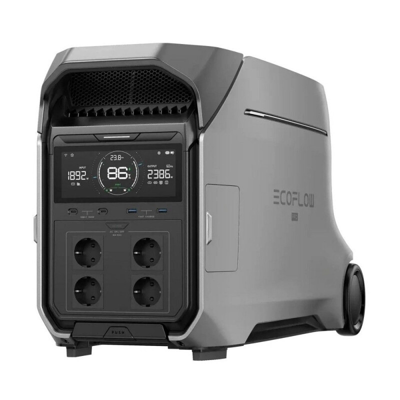 Портативна зарядна станція EcoFlow DELTA Pro 3 забезпечує до 4000 Вт потужності (ємність 4096 Вт·год), з можливістю розширення до 12000 Вт·год, підтримує швидку зарядку та інтелектуальне керування, відрізняється тихою роботою. Може живити прилади, що споживають більше 4000 Вт, гарантує безперебійну роботу електрообладнання.