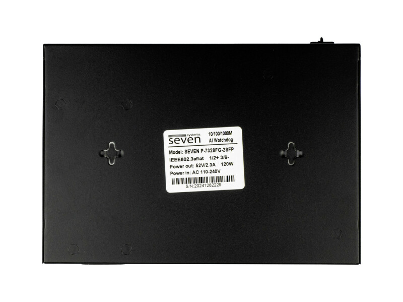 SEVEN P-7328FG-2SFP – це PoE-комутатор з підтримкою WatchDog AI та повністю гігабітними портами, який дозволяє підключати не лише IP-камери, а й інші мережеві пристрої, що потребують живлення через PoE, наприклад гігабітні точки доступу або VoIP-телефони. Він поєднує високу швидкість передачі даних, надійність та розширені функції, такі як автоматичний перезапуск пристроїв і підключення через оптику (SFP).