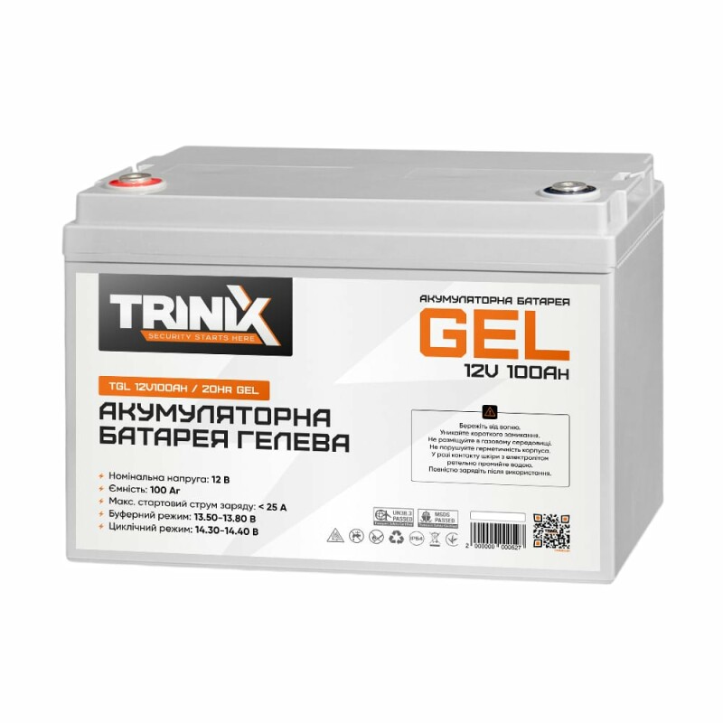 Акумуляторна батарея Trinix TGL12V100Ah/20Hr GEL ємністю 100 Аг, з вихідною напругою 12 В, тип – гелева (GEL).