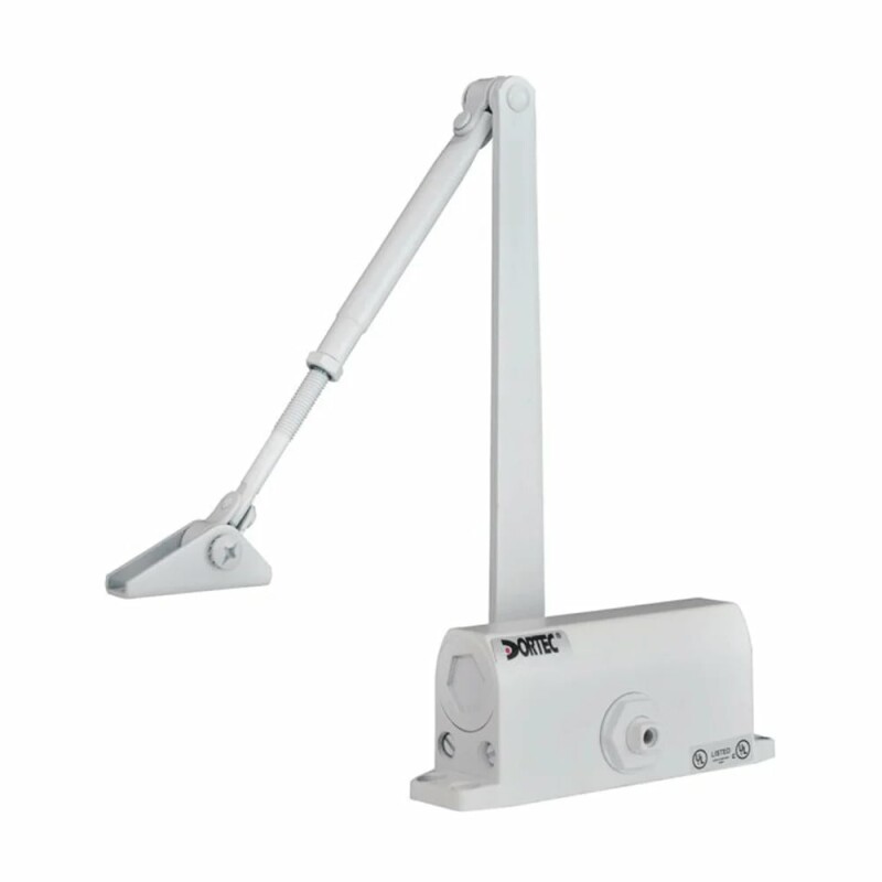 Дверний доводчик Dortec DT-63H White зі складаним важелем, з функцією утримання дверей у відчиненому положенні під кутом 85°. Маса дверного полотна 45-65 кг.