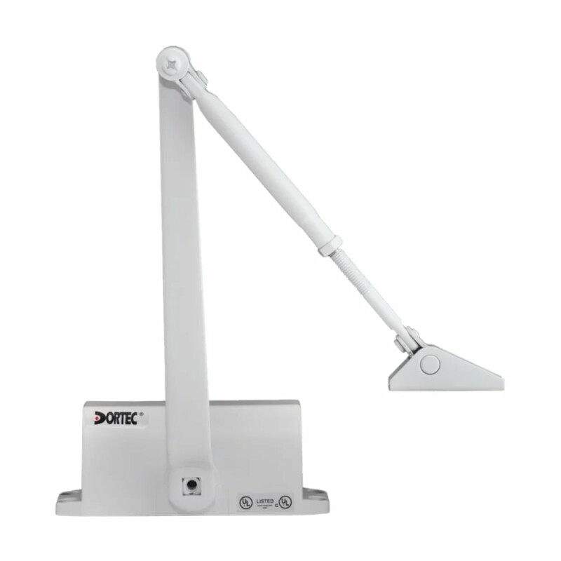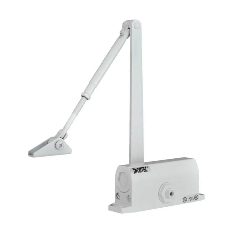 Дверний доводчик Dortec DT-62H White зі складаним важелем, з функцією утримання дверей у відчиненому положенні під кутом 85°. Маса дверного полотна 25-45 кг.
