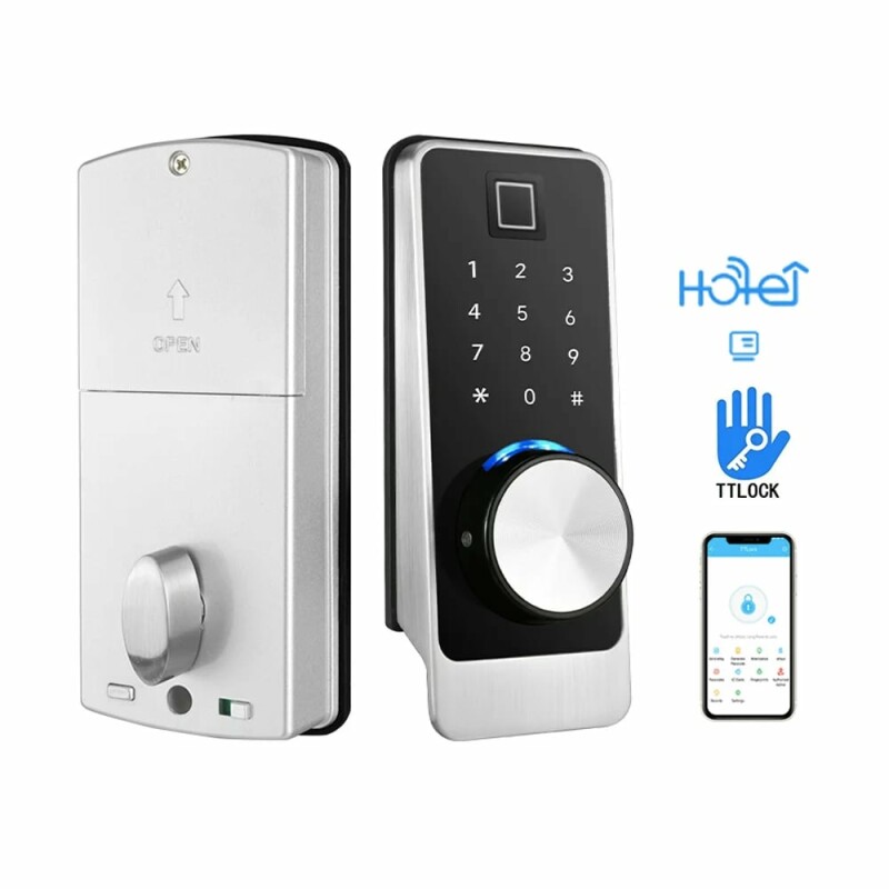 Trinix TRL-5203BTF Silver Left – біометричний автономний електрозамок з підтримкою Bluetooth, з доступом за відбитком пальця, кодом, карткою Mifare, ключем, через застосунок TTLock / TTHotel. Підтримка до 200 користувачів за відбитком пальця, 100 за карткою доступу та 150 за кодом. Встановлення на лівобічні двері.