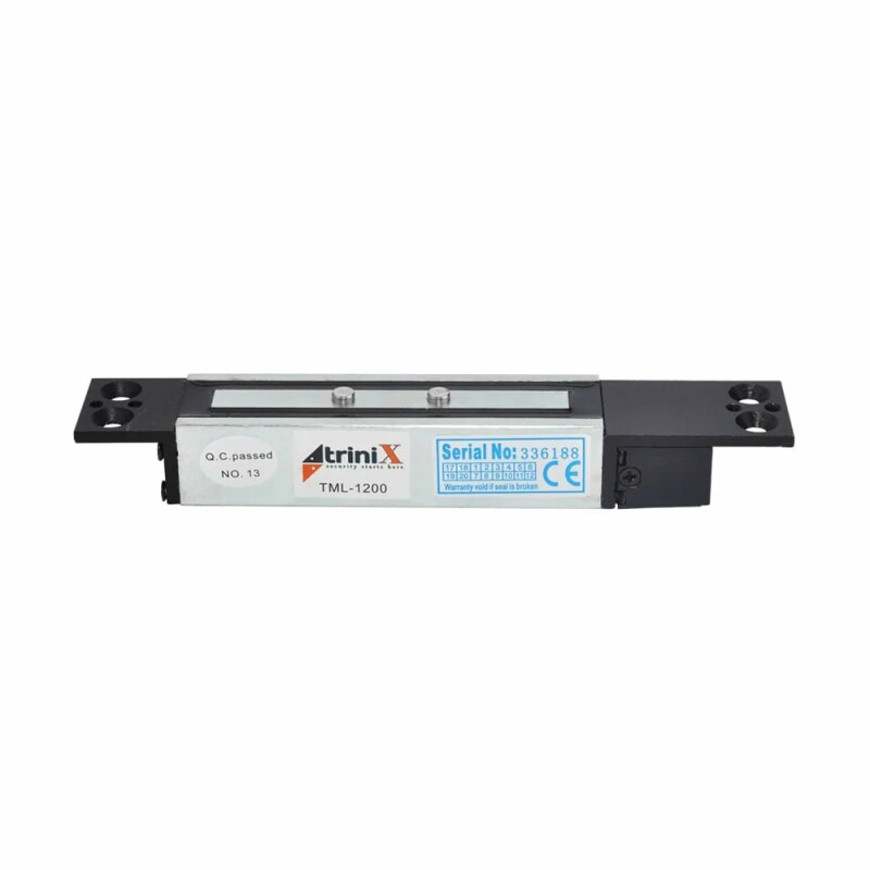 Електромагнітний замок Trinix TML-1200 з силою утримання до 1200 кг. Живлення 12 В, споживання 250 мА. Таймер затримки від 1 до 20 секунд. Врізний монтаж.