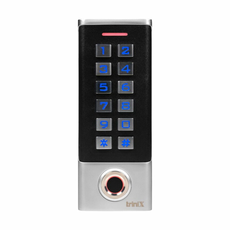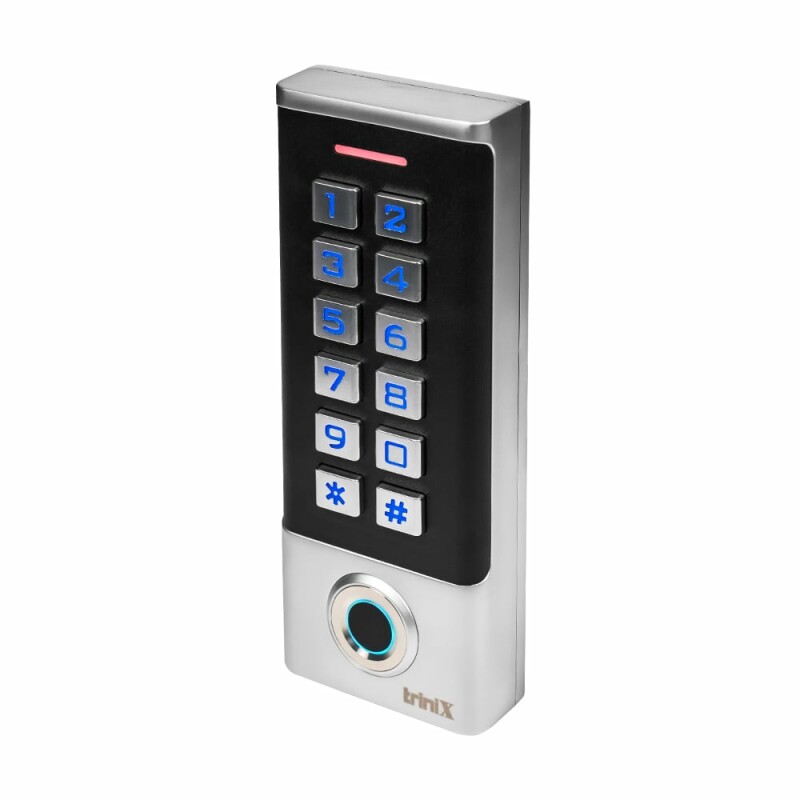 Автономна клавіатура/контролер Trinix TRK-1102MFW, зі скануванням відбитків пальців і зчитувачем Mifare 13.56 МГц. Підтримується декілька способів доступу: за допомогою сканування відбитку пальця / коду доступу / зчитування карти. Металевий антивандальний корпус, клас захисту IP65, підходить для вуличного встановлення.