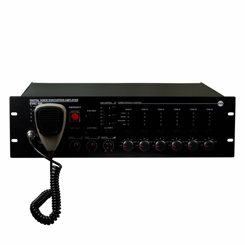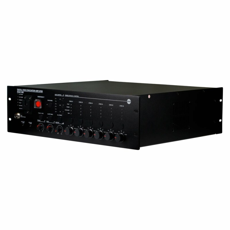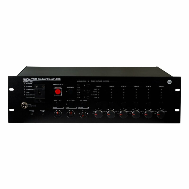 Підсилювач-контролер CMX EVAC-500, 6 зон, 19". Контролер системи оповіщення про пожежу EVAC-500 це сертифікована система оповіщення та голосової евакуації згідно з EN54-16. Це універсальний контролер що вміщує в собі: програмне забезпечення для віддаленого доступу з ПК, контролер пейджингу зон, моніторинг всіх основних сигнальних ліній, управління підсилювачем, контроль ліній гучномовців, моніторинг роботи блока живлення та підсилювача потужності, резервне перемикання підсилювача потужності та незалежне регулювання гучності по зонах, диктофон, вбудований слот для SD-карти, аварійний мікрофон та інтерфейс пожежної сигналізації. Контролер оснащений найновішим цифровим сигнальним процесором DSP для забезпечення якості звучання Hi-Fi та неперевершену обробку сигналу у випадку комерційного повідомлення або аварійного оповіщення. Номінальна потужність 500 Вт, постійна вихідна напруга 0-100В.