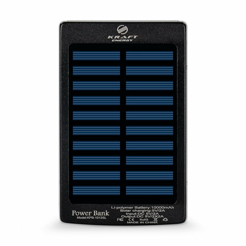 Повербанк Kraft KPB-1012SL Black з сонячною панеллю. Ємність батареї 10000 мАг, літій-полімерна технологія, інтерфейси: вхід microUSB 5 В/2.1 А, виходи 2 USB 5 В/3.5 А. Вбудований LED-ліхтар.