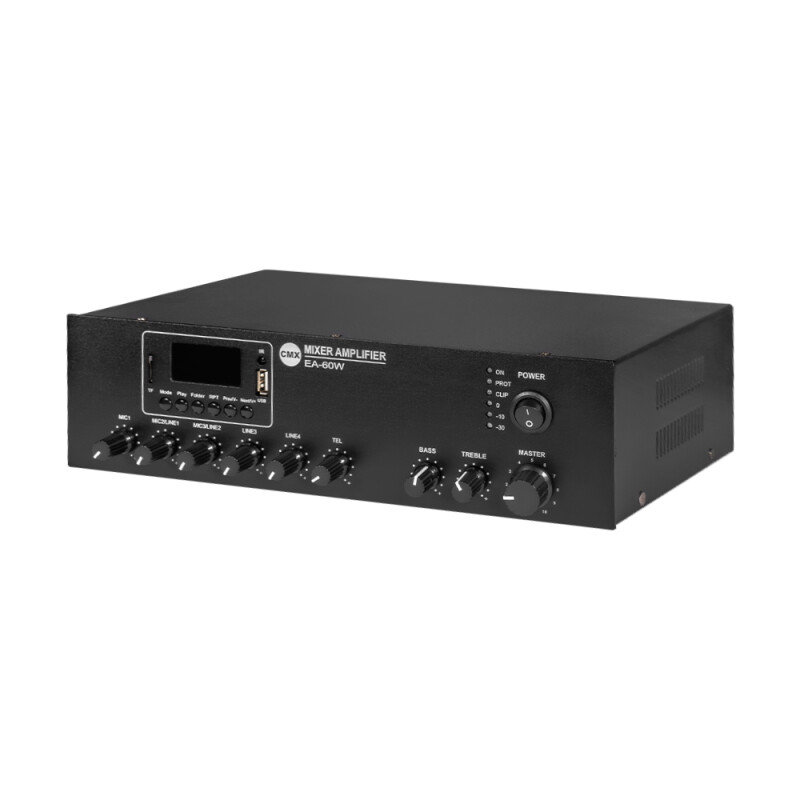 Настільний мікшуючий підсилювач CMX EA-60W з WiFi, з вихідною потужністю 60 Вт і підтримкою потокового мовлення через Bluetooth і WiFi. Вбудований медіаплеєр з MP3/USB/FM-тюнером/Bluetooth, слот для SD-карти. Підтримує віддалене керування через застосунок WiFi Legacy Player на смартфоні. Вихід на гучномовець 100В/70В/4-16 Ом.