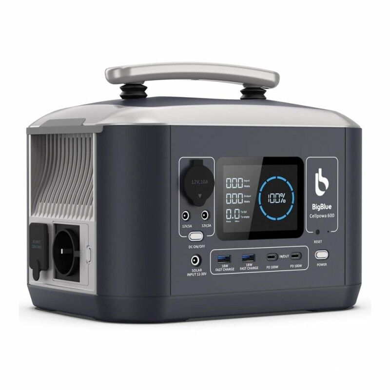 Портативна зарядна станція BigBlue CP600 з функцією ДБЖ, з номінальною потужністю 600 Вт, піковою потужністю 1200 Вт, вихідна напруга 230 В, чиста синусоїда. Вбудована акумуляторна батарея LiFePO4 потужністю 1075.2 Втг. Зарядна станція може одночасно заряджати до 8 пристроїв (завдяки вбудованим вихідним портам). Можливість заряджання станції від електромережі (вбудований зарядний пристрій 300 Вт), від сонячної панелі максимальною потужністю 120 Вт (слід придбати окремо), від прикурювача (зарядний кабель у комплекті). Час заряду від електромережі до 80% становить 1.5 години. LED-підсвічування з трьома режимами роботи.