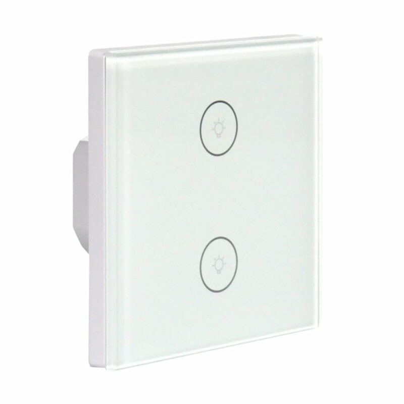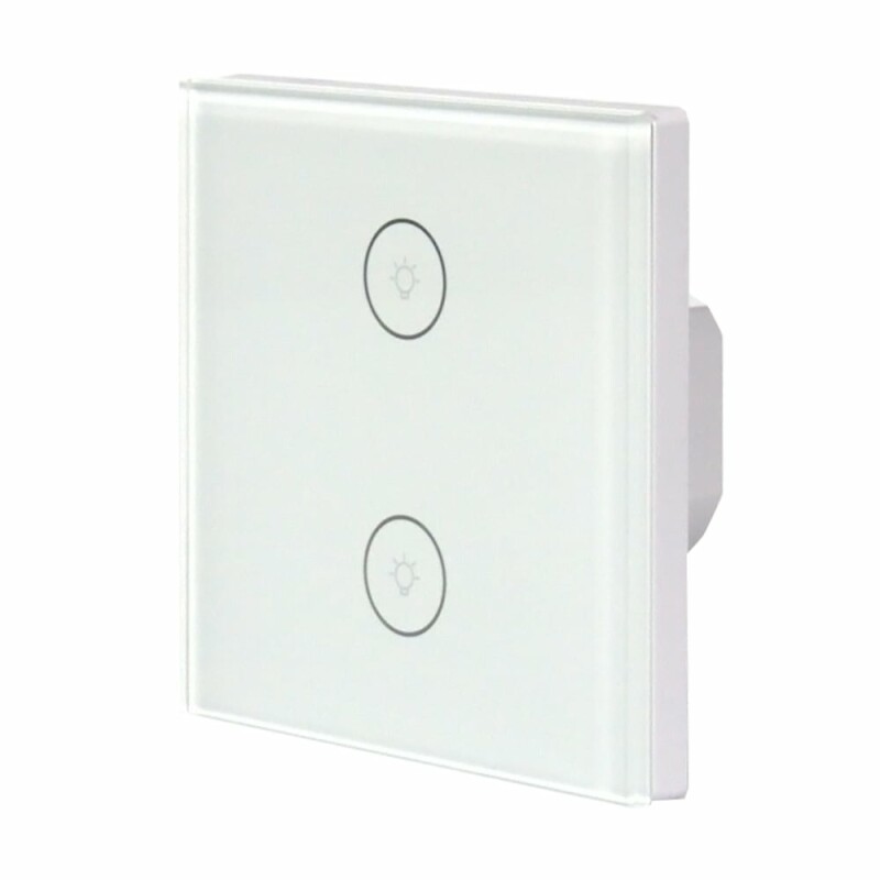 Розумний подвійний вимикач світла Trinix TRX-LS02(WiFi) з підтримкою WiFi 2.4 ГГц (IEEE 802.11b/g/n) та можливістю керування і налаштування через мобільний застосунок Tuya. Сенсорні кнопки керування. Голосове керування через Google Assistant та Amazon Alexa. Можливість встановити таймер та розклад увімкнення/вимкнення освітлення.