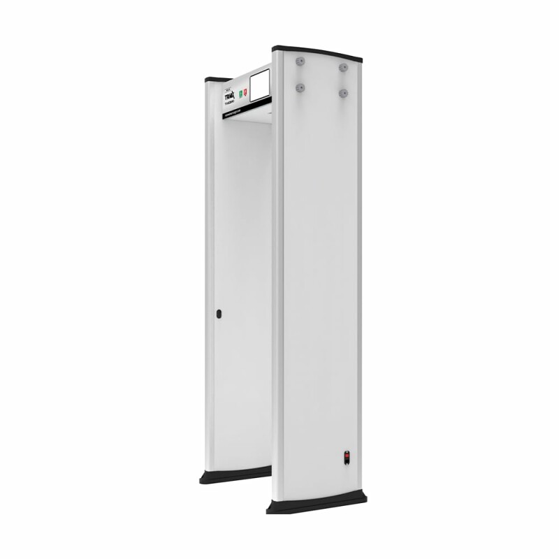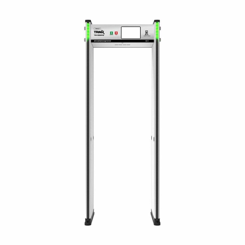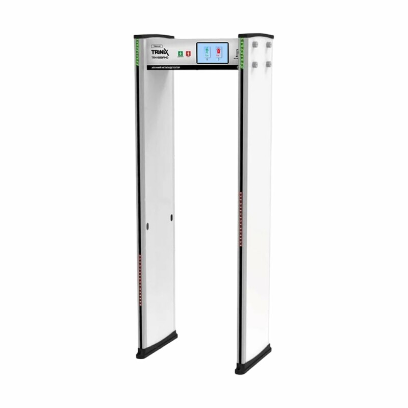 Арочний металодетектор Trinix TRX800AMD з 33 зонами детекції та 2000 рівнями чутливості, 10-дюймовий сенсорний LCD-екран, світлодіодна та звукова індикація, лічильник проходів і тривог, захист паролем зміни параметрів.