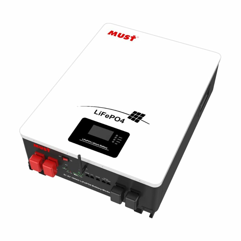 Must LP16-48100 – літій-залізо-фосфатна акумуляторна батарея напругою 51.2 В та ємністю 100 Аг / 5120 Втг, складова системи накопичення енергії. Максимальний струм заряду/розряду 100 А/100 А. Ресурс: 6000 циклів заряджання-розряджання. Комунікаційні порти CAN, RS485, RS232, WiFi. В одну систему можна підключити до 15 акумуляторних модулів. Настінний монтаж.