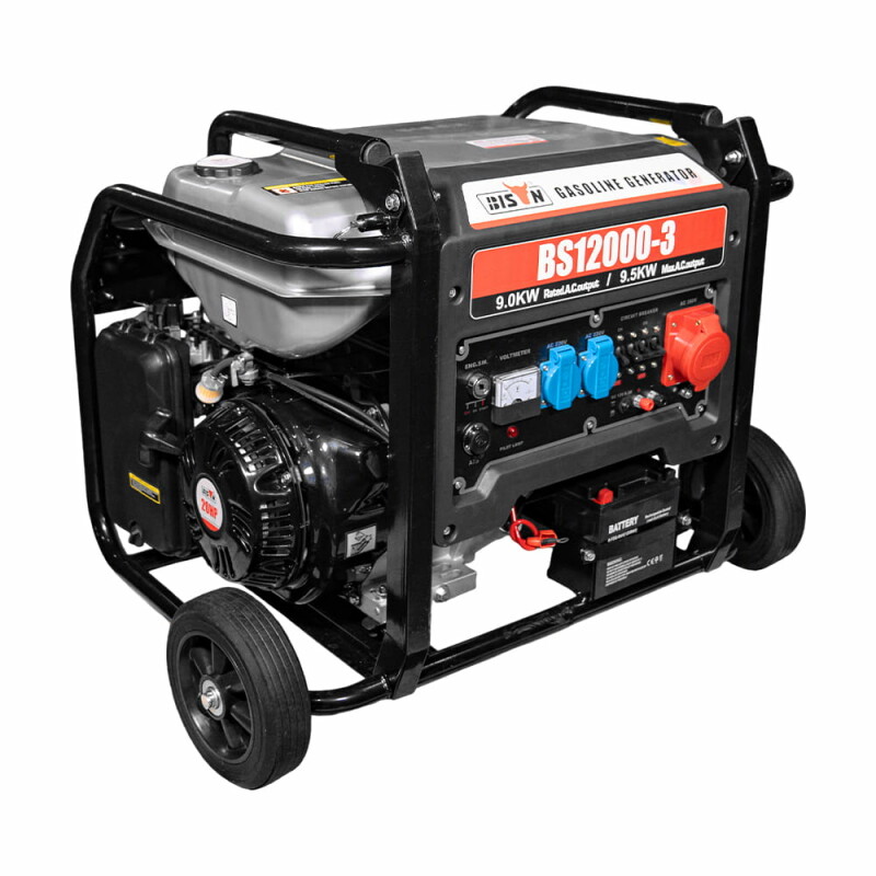 Генератор бензиновий трифазний Bison BS12000-3 з номінальною потужністю 9 кВт / максимальною потужність 9.5 кВт, вихідна напруга AC 220/380 В, 2 розетки 220 В, 1 розетка 380 В. Тип запуску: електричний стартер / ручний, роз’єм для підключення автоматичного введення резерву (ATS). Одноциліндровий двигун об'ємом 499 см.куб., об'єм паливного баку 25 л, об'єм мастила в картері 1.2 л.