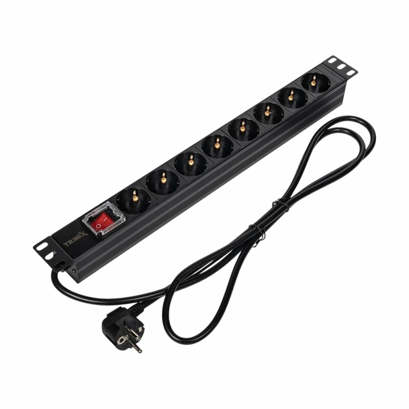 Блок розеток Trinix TRX-PDU/8M-16А Black з вимикачем призначений для встановлення у комутаційній шафі стандарту 19". Оснащений 8 розетками стандарту Schuko з номінальною напругою AC 220 В, максимальним струмом 16 А, максимальною потужністю навантаження 4000 Вт.