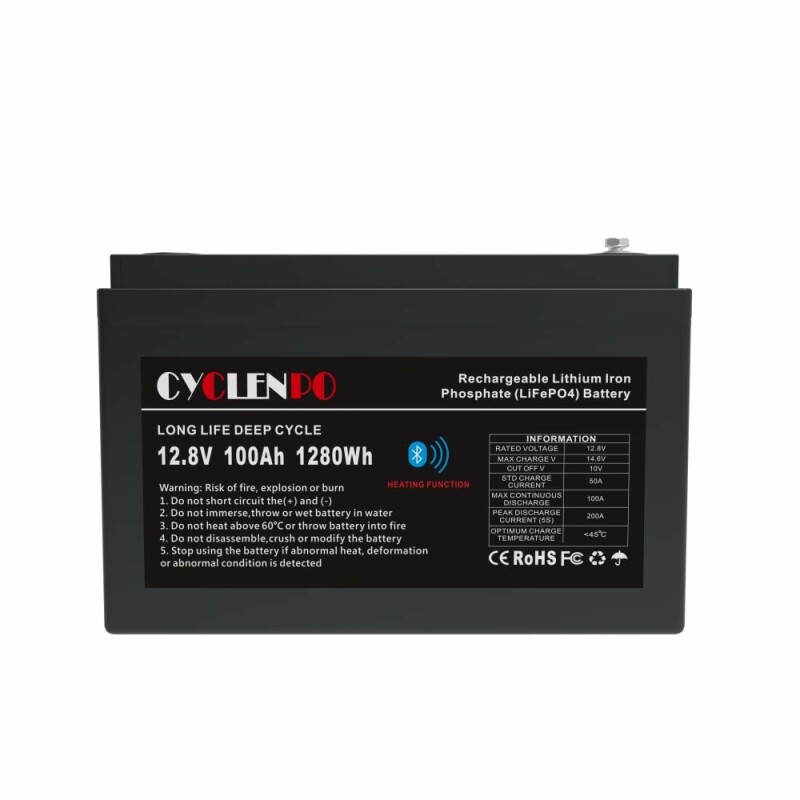Акумуляторна батарея Cyclen 12.8V 100AH LiFePo4 (підігрів/Bluetooth) ємністю 100 Аг, з вихідною напругою 12.8 В, тип – літій-залізо-фосфатна (LiFePO4), кількість циклів: > 6000. Вбудована функція підігріву та Bluetooth.