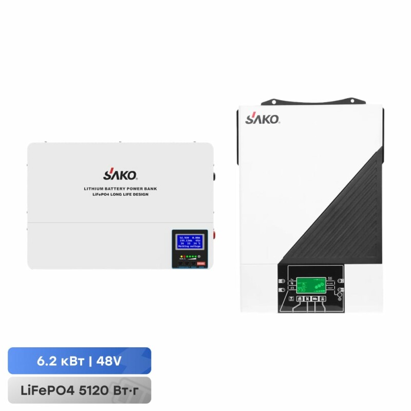 Комплект резервного живлення Sako: гібридний інвертор 6.2 кВт SUNON IV 48В +120A MPPT й акумуляторна батарея 51.2В 5120Втг Li-Wall series LiFePo4