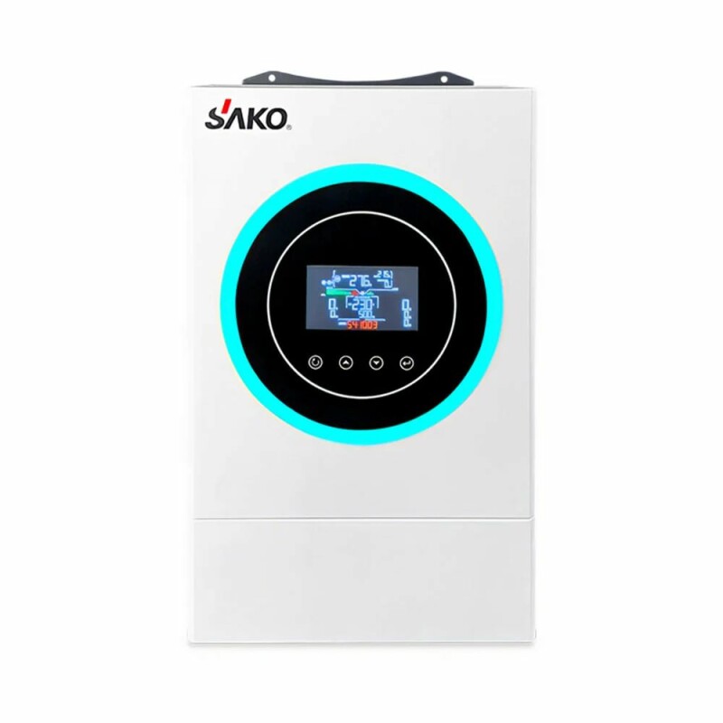 Гібридний однофазний інвертор Sako SUNON V 4.5KVA/4200W/24V+120A MPPT з максимальною потужністю 4.2 кВА/4.2 кВт (максимальна короткочасна потужність 8.4 кВА), вбудований MPPT-контролер та зарядний пристрій. Має правильну синусоїду на виході 220 В. Діапазон вхідної напруги 90-280 В, від сонячних панелей 60-450 В. Максимальний струм заряду 120 А. Напруга акумуляторної системи 24 В. Підтримка підключення акумуляторних батарей типу AGM/GEL/LiFePo4/Li-ion. Вихідна напруга 230 В ±5%. Інтерфейси RS485, CAN, RS232, USB, сухі контакти, вбудований локальний WiFi – лише для віддаленого моніторингу з мобільного застосунку. Можливість працювати без підключення акумуляторних батарей. Сенсорний LCD-дисплей. Може підключатися до генератора.