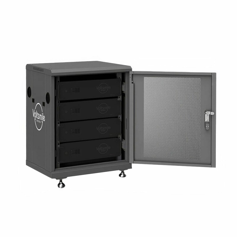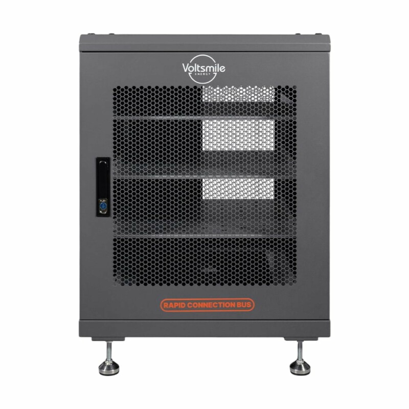 Шафа 19" висотою 14U Voltsmile RPC cabinet – це обладнання для швидкого встановлення і підключення акумуляторної системи накопичення енергії, що включає себе шкаф для встановлення акумуляторних батарей RPC-V10 з максимальним струмом для вбудованої панелі постійного струму 350 А та систему підключення кабелів живлення, передачі даних і заземлення. Максимальна кількість акумуляторних батарей у шафі – 4. Акумуляторні батареї до комплекту не входять – їх слід придбати окремо.