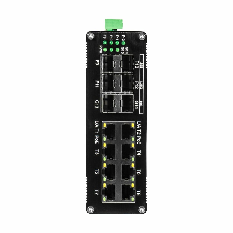 • PoE-комутатор має 14 портів, з них 8 портів PoE RJ45 10/100/1000M Base-T, 4 порти SFP 1000M Base-X та 2 SFP+ порти 10G Base-SR/LR.