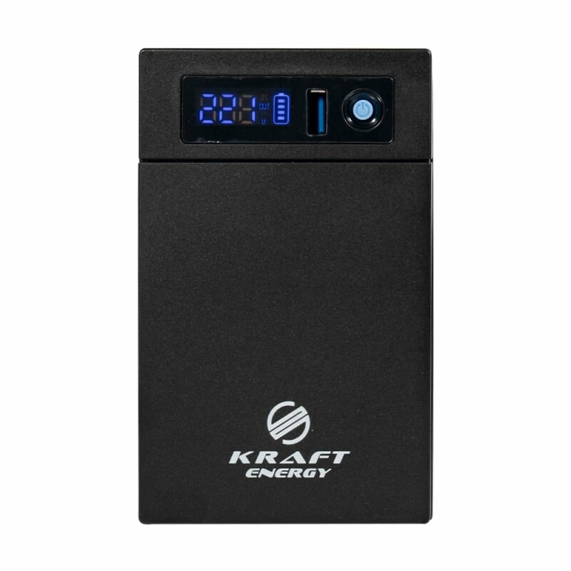 Джерело безперебійного живлення (ДБЖ) Kraft KRF-1200VA/720W(LED)LiFePO4 UPS, лінійно-інтерактивне, з вихідною потужністю (байпас) - 1200 ВА / 720 Вт та вихідною потужністю при роботі від АКБ 600 ВА / 360 Вт, з апроксимованою синусоїдою, з вбудованою літій-залізо-фосфатною (LiFePO4) акумуляторною батареєю 25.6 В 150 Вт·год, з LCD-дисплеєм та 2 розетками.