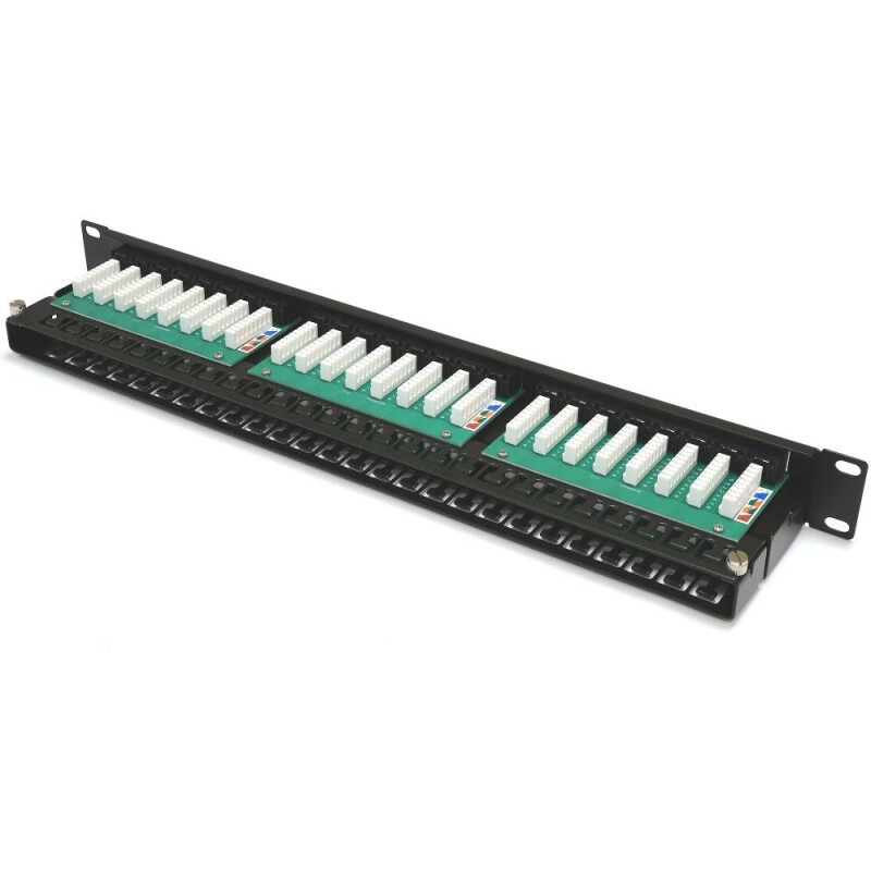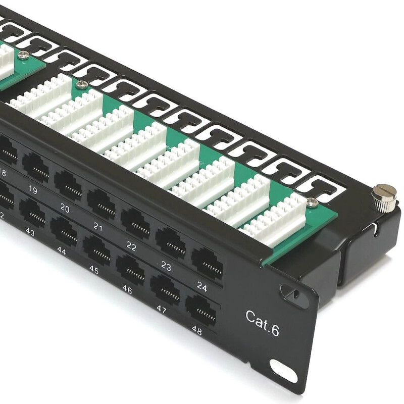 Патч-панель 19" 48xRJ-45 UTP, кат. 6, 1U, dual type, Kingda призначена для організації структурованої кабельної системи в серверних і телекомунікаційних стійках. Модель розрахована на монтаж в 19-дюймову шафу з висотою 1U і фіксується в чотирьох точках. Конструкція виконана зі сталі з пластиковими модулями під конектори RJ-45, не передбачає екранування і заземлення. На фронтальній панелі розміщені 48 портів RJ-45 з цифровим маркуванням для швидкого підключення патч-кордів. Зі зворотного боку встановлені пластикові модулі з мідними ножами для надійної фіксації витої пари методом «забивання», а також колірна схема A і B для зручності монтажу. Кабельний організатор розрахований на 48 лінків і забезпечує акуратне кріплення проводів за допомогою пластикових стяжок.