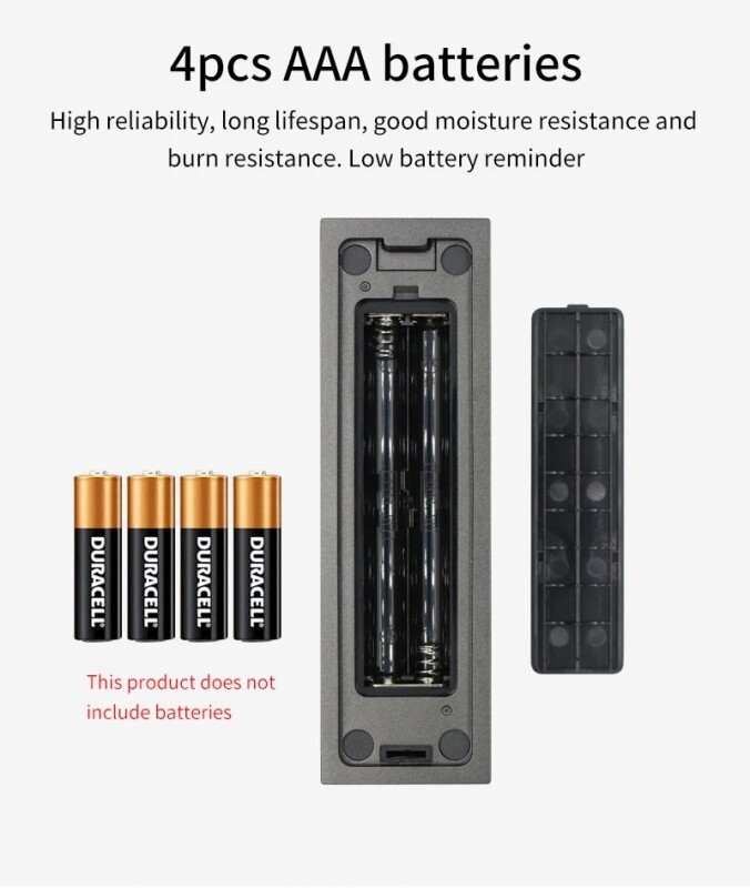 - Енергоефективність — живлення від 4 батарейок ААА, низький струм у режимі очікування (20 мкА).