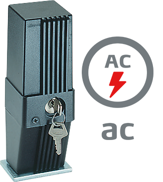 Електрозамок BFT з живленням 230 В. Цей автоматичний електричний замок складається з оцинкованого сталевого стрижня, який на початку руху стулки піднімається та відчиняє ворота, а коли ворота зачиняються, стрижень падає та замикає стулку.