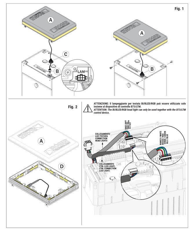 - Стрічка поставляється з кабелем підключення, який під’єднується до відповідного виходу на платі управління шлагбаума Roger Technology (зазвичай роз’єм, підписаний як LED OUT або STRIP RGB).