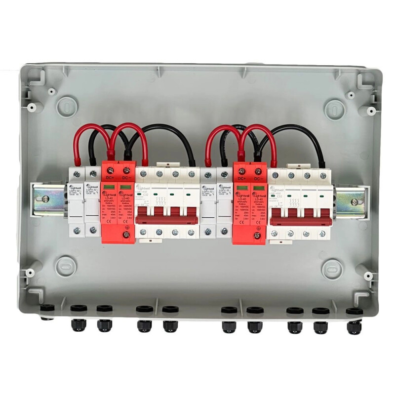 Комбінатор для сонячних панелей LQX2/2DC1000VB1-1532-PG забезпечує надійну комутацію та захист обладнання від пошкоджень при аварійних режимах у системах постійного струму до 1000V DC. Вбудовані компоненти (автоматичний вимикач, запобіжники, пристрій захисту від перенапруг) гарантують безпеку та стабільну роботу PV-систем.