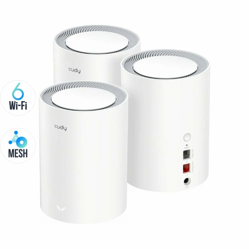 Mesh-система, комплект з 3 пристроїв WiFi 6 Mesh 2.5G пристроїв, дводіапазонний; чипсет MT7981BA + MT7976CN; 802.11ax/ac/a/b/g/n; 2402 Мбіт/с на 5 ГГц + 574 Мбіт/с на 2.4 ГГц; порти: 2.5G WAN + гігабітний LAN; 5 внутрішніх антен; MU-MIMO; DDNS; VPN-клієнт PPTP / L2TP / OpenVPN / WireGuard / IPsec; підтримка сервісу Zerotier; DNS через CloudFlare / NextDNS / Google; IPv6, безшовний роумінг; WPA3; протоколи віддаленого керування TR069 / TR098 / TR111 / TR181; живлення 12 В/1 А, блок живлення у комплекті; розміри 154 (висота) / 109 (діаметр) мм