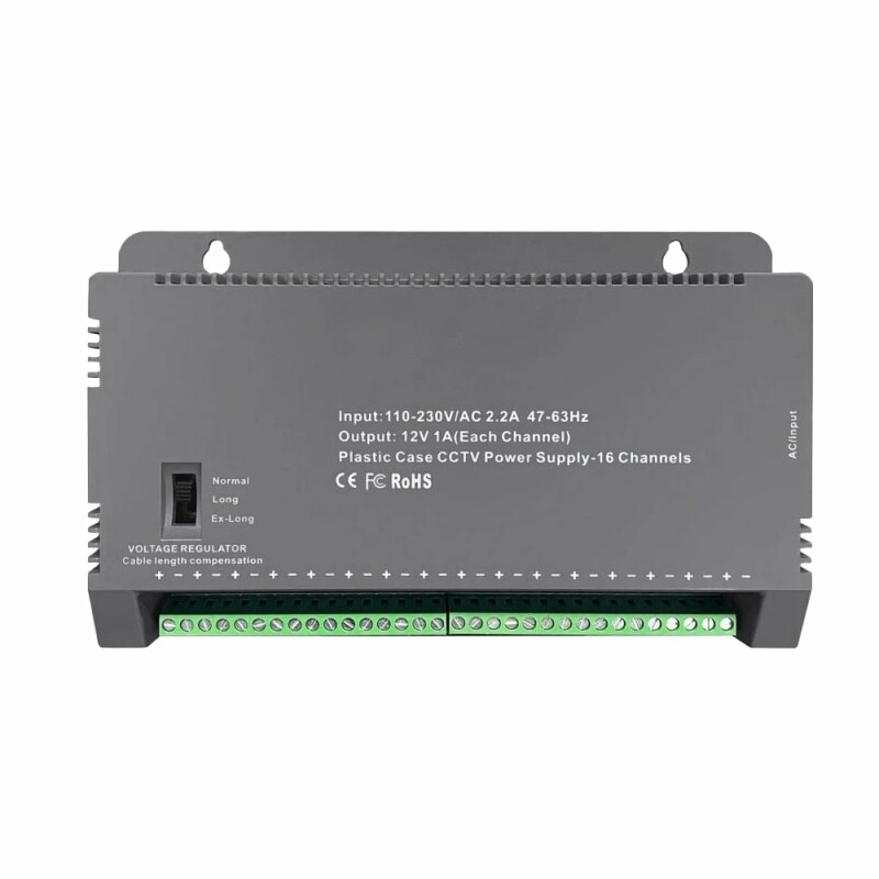 Імпульсний блок живлення на 16 каналів навантаження; номінальна вихідна напруга 12 В, максимальний струм на канал 1 А; загальна вихідна потужність 200 Вт; вхідна напруга/струм AC 110-230 В/2.2 А; світлова індикація; захист від перевантаження за струмом, короткого замикання та перенапруги; пластиковий корпус, настінний монтаж; розміри 190 / 120 / 34 мм