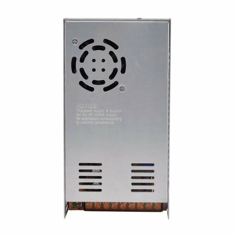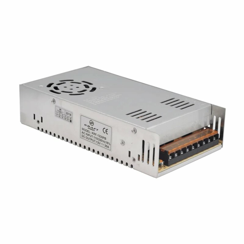 Блок живлення імпульсний Kraft KRF-1230PB, 3 канали навантаження, вхідна напруга 150-265 В, вихідна напруга 12 В, вихідний струм 30 А. Металевий корпус, вентилятор охолодження.